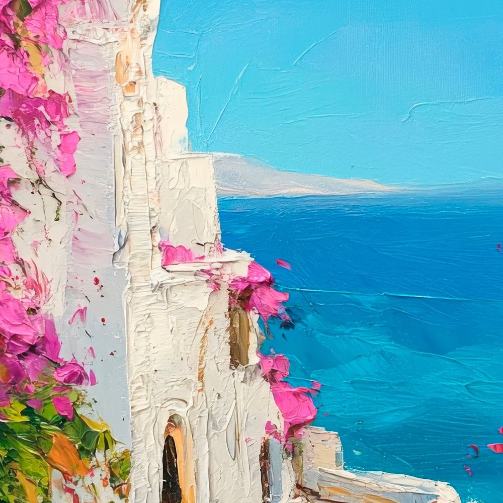 Un passage enchanteur fait de murs d'un blanc éclatant, encadré de bougainvilliers à la floraison vive et rose vif. La vue étendue sur la mer scintillante, d'un bleu azur, procure un sentiment de liberté et de paix. Le mariage harmonieux de la nature et de l'architecture permet de ressentir l'âme de l'idylle méditerranéenne. Un lieu où les rêves prennent vie.