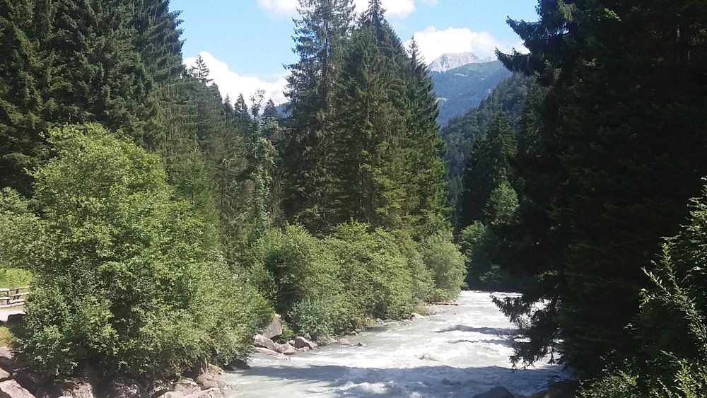 Ruisseau coulant dans les Dolomites, Brenta, Italie, entre les montagnes, avec un pont et des rochers dans l'eau.