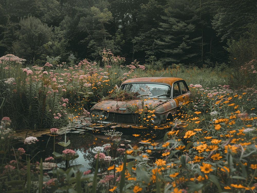 Cette impression impressionnante montre une voiture de collection négligée, complètement envahie par les fleurs et les buissons. La scène, en pleine nature ou près d'un étang, dégage une atmosphère de désolation et d'éphémère. La voiture, autrefois symbole de fierté et de mobilité, est aujourd'hui le témoin silencieux du temps qui passe. La flore luxuriante aux douces couleurs pastel contraste magnifiquement avec le métal rouillé et altéré de la voiture ancienne, évoquant un sentiment de beauté sereine et de mélancolie. Parfaite pour les amateurs de décorations rustiques et nostalgiques, cette impression apporte un charme unique et une touche de romantisme à n'importe quelle pièce.