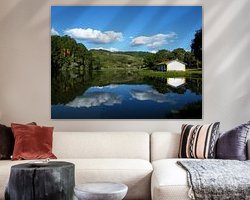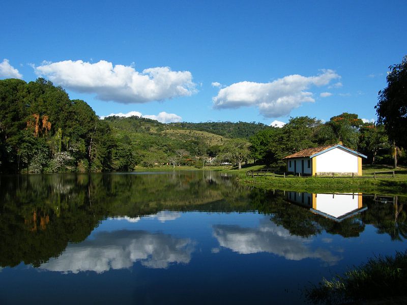 Weerspiegeling van een arbeidershuisje op een koffieplantage in Brazilië. Gefotografeerd na de lunch dus tijdens het rustuurtje.