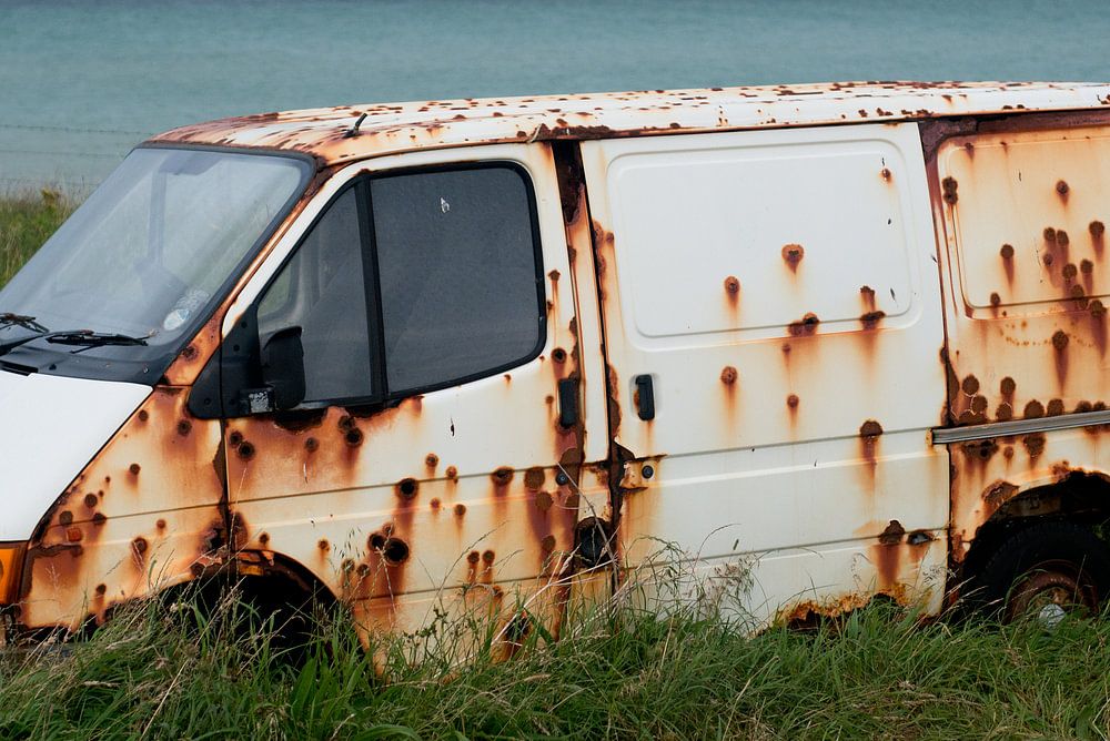 Un Ford Transit blanc rouillé dans un pâturage de l'île écossaise de Barra. En arrière-plan, la mer et les montagnes. Fin du voyage de ce bus... Ou bien l'aventure se poursuit-elle avec vous au mur ?
