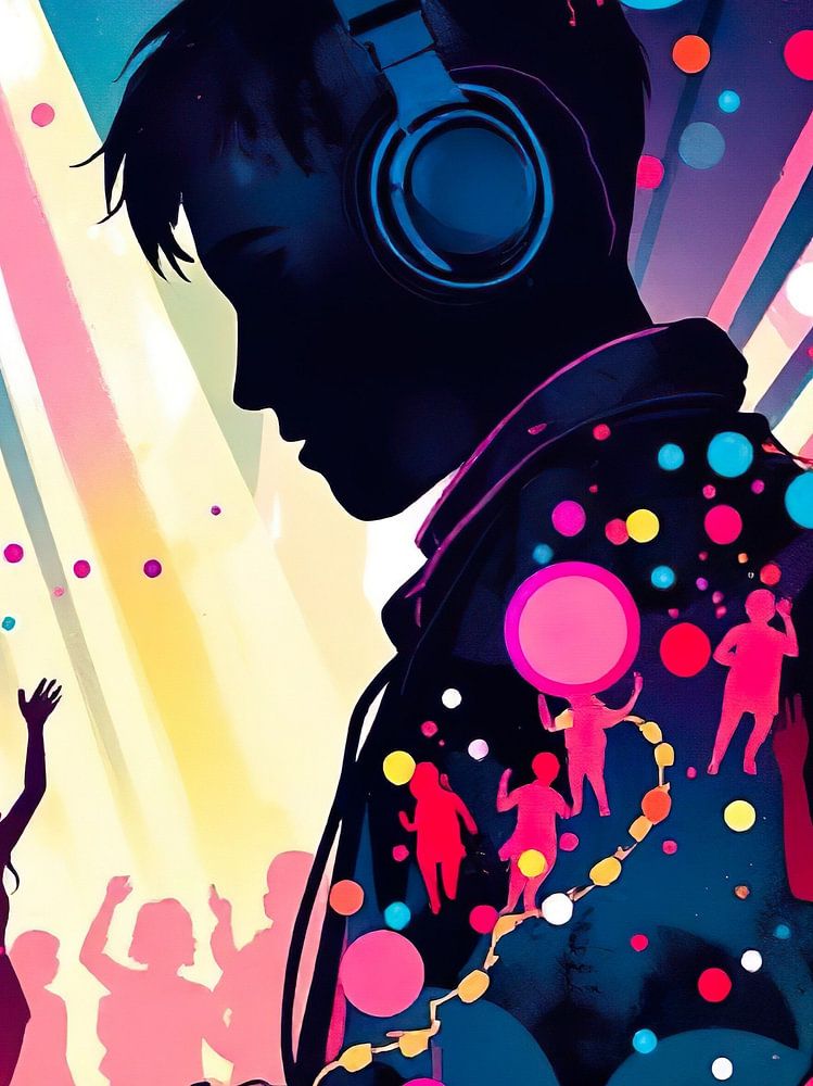Une œuvre d'art explosive et colorée qui capture l'énergie et la magie d'une nuit dans un club. La silhouette d'un DJ avec de gros écouteurs domine l'image, tandis qu'à l'arrière-plan, une foule dansante est absorbée par la musique et le rythme. La composition dynamique est rehaussée par des couleurs vives, des formes abstraites et des rayons de lumière qui semblent traverser l'espace. Des éclats de rose, de bleu, de jaune et de violet créent une atmosphère festive qui rappelle un monde où la musique et le mouvement convergent.