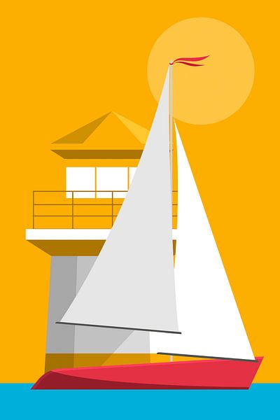 Un voilier stylisé glisse tranquillement le long d'un phare moderne, sur fond de soleil radieux et doré.