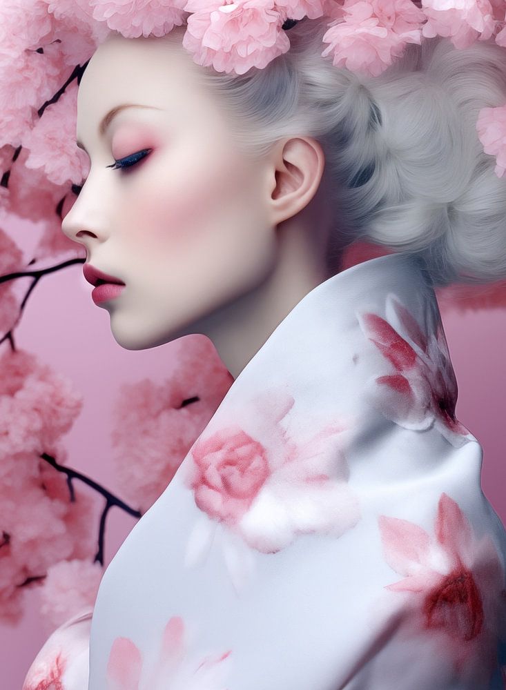 Portrait de profil d'une femme en kimono de soie fleurie gris-bleu avec des cheveux gris relevés sur un fond rose avec des fleurs de cerisier.
