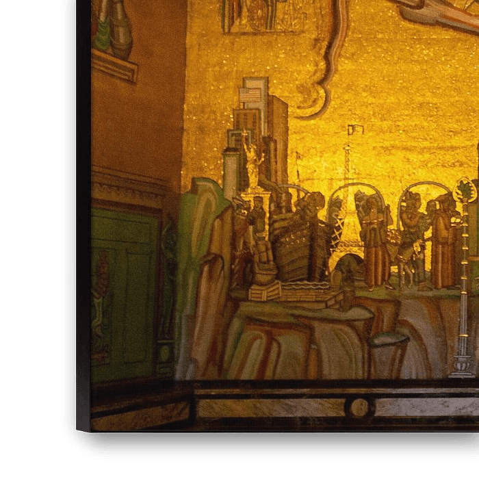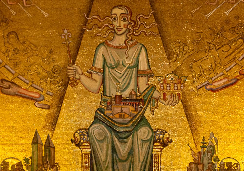 L'hôtel de ville de Stockholm a été construit au début du XXe siècle dans le style romano-national. C'est une icône de la ville et chaque année, un grand banquet y a lieu après la remise des prix Nobel. Le Golden Hall est le plus monumental avec sa mosaïque murale de 18 millions de pièces de verre et d'or. L'image représente la ville de Stockholm sous la forme de la reine de Mälaren, le lac qui embrasse la ville.