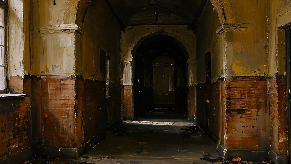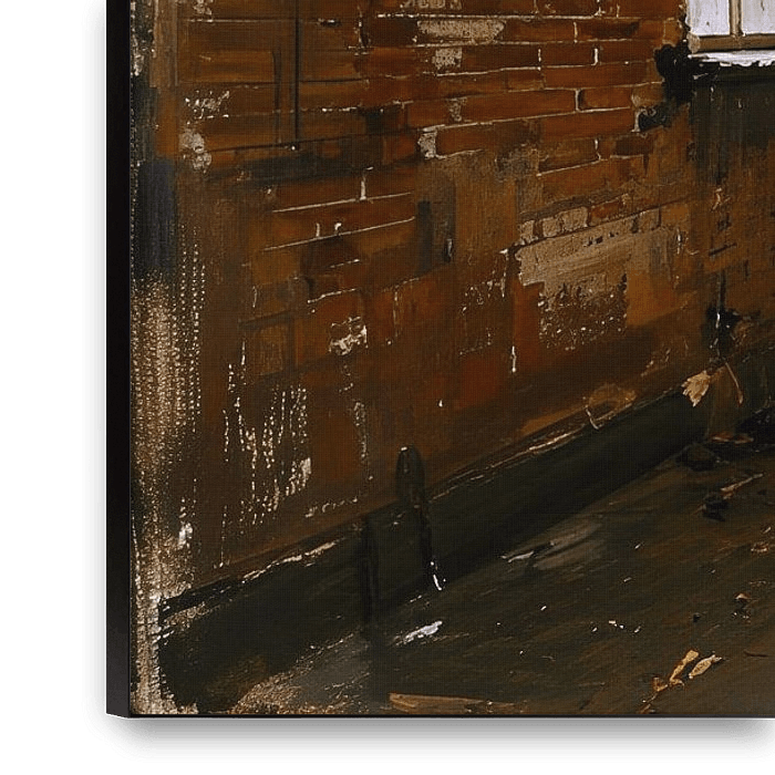 Cette peinture évocatrice de style impressionniste représente le couloir désert d'un bâtiment historique. La lumière du soleil pénètre à travers une haute fenêtre et se reflète sur le sol usé, mettant en valeur les textures des murs en briques et du crépi effrité. Le jeu d'ombres et de lumières dans les arcades profondes crée une…