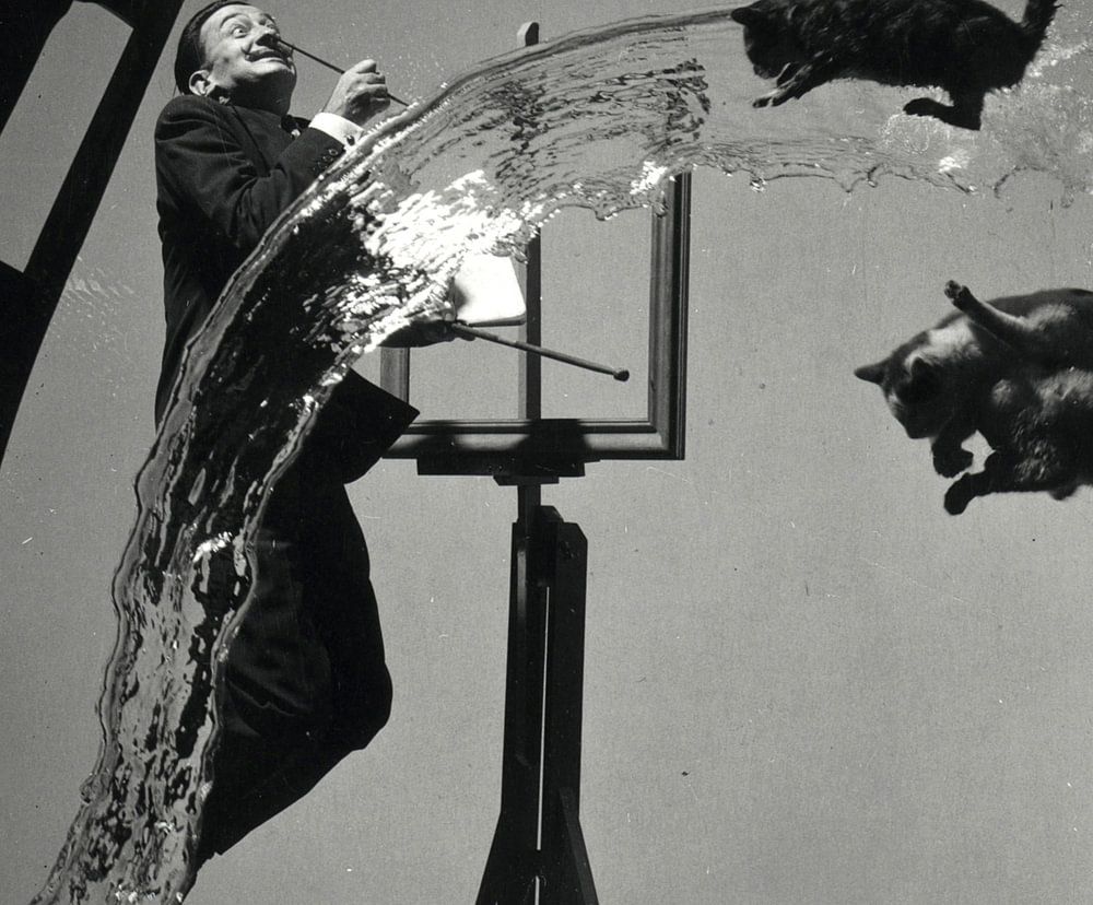 En 1941, le photographe américain Philippe Halsman rencontre l'artiste surréaliste Salvador Dalí à New York et ils commencent à collaborer à la fin des années 1940. L'œuvre Dali Atomicus de 1948 explore l'idée de suspension, représentant trois chats qui volent, de l'eau jetée d'un seau, un chevalet, un pouf et Salvador Dalí, tous apparemment suspendus dans les airs. Le titre de la photographie est une référence à l'œuvre de Dalí, Leda Atomica (que l'on peut voir à droite de la photographie, derrière les deux chats). Halsman a indiqué qu'il a fallu 28 tentatives pour être satisfait du résultat. Il s'agit de la version non retouchée de la photographie qui a été publiée dans le magazine LIFE. Dans cette version, on peut encore voir les fils qui suspendent le chevalet et le tableau, la main de l'assistant qui tient la chaise et l'étai qui soutient le pouf.
