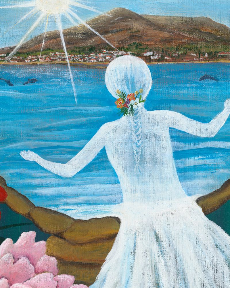 Samothraki, une île grecque unique et magique. Ma peinture avait déjà voyagé avant moi, en émergeant sur la toile avant même que je sache que j'allais là-bas ou que j'en aie entendu parler. Intuitivement, elle apparaissait déjà sur la toile et les éléments montraient clairement sa relation avec cette île. L'image est devenue magnifiquement colorée avec, au premier plan, la femme en blanc dans sa robe en forme de cascade. Cette île est connue pour ses magnifiques chutes d'eau et sa haute montagne qui couvre la majeure partie de l'île et a un effet magique.