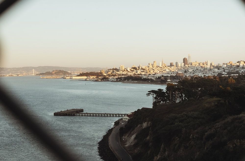 Depuis le rouge et célèbre Golden Gate Bridge, j'ai photographié la grande ville au coucher du soleil. Le pont est entouré de clôtures afin que vous ne puissiez pas sauter du pont juste comme ça.