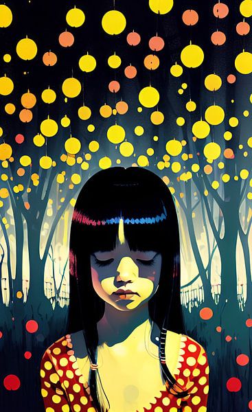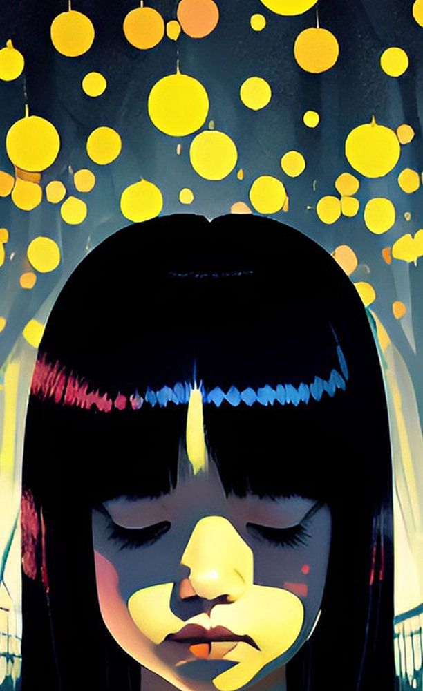 Ses tresses de corbeau coulent comme un ruisseau de minuit, Ses yeux, des bassins profonds, reflétant la lueur du clair de lune. Un kimono ornait sa gracieuse silhouette, Alors qu'elle se promenait dans le sanctuaire, l'esprit enflammé.