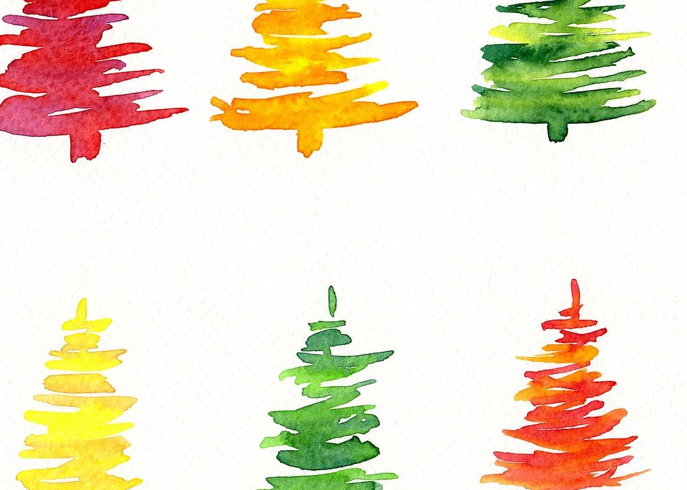 Des sapins colorés et abstraits sont disposés en deux rangées, chacune représentée dans une teinte unique en nuances de toutes les couleurs de l'arc-en-ciel : jaune, orange, rouge, rose, violet, bleu et vert. Le design vivant et ludique crée une atmosphère festive et joyeuse.