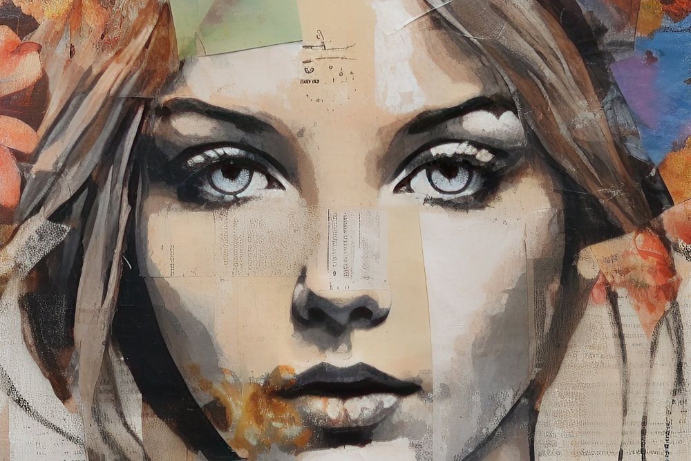 Sara Portrait - peinture abstraite / mixed media art peint. Joli contraste entre un portrait sophistiqué et une technique de collage/peinture brute.