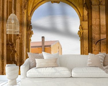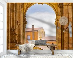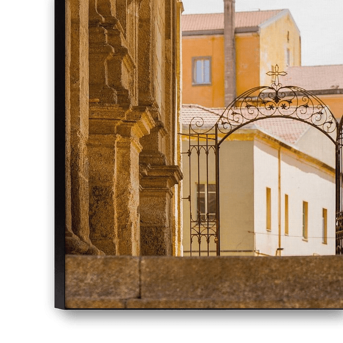 La lumière presque filtrée sur les bâtiments aux couleurs pastel à l'arrière-plan contraste joliment avec les lignes fines du portail en fer noir.