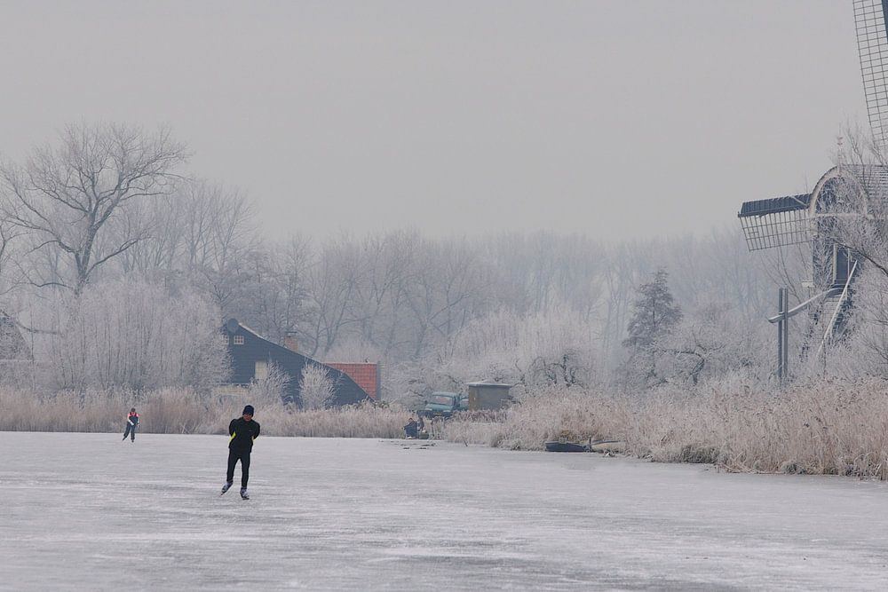 Patineur avec un moulin à vent en arrière-plan. Scène néerlandaise
