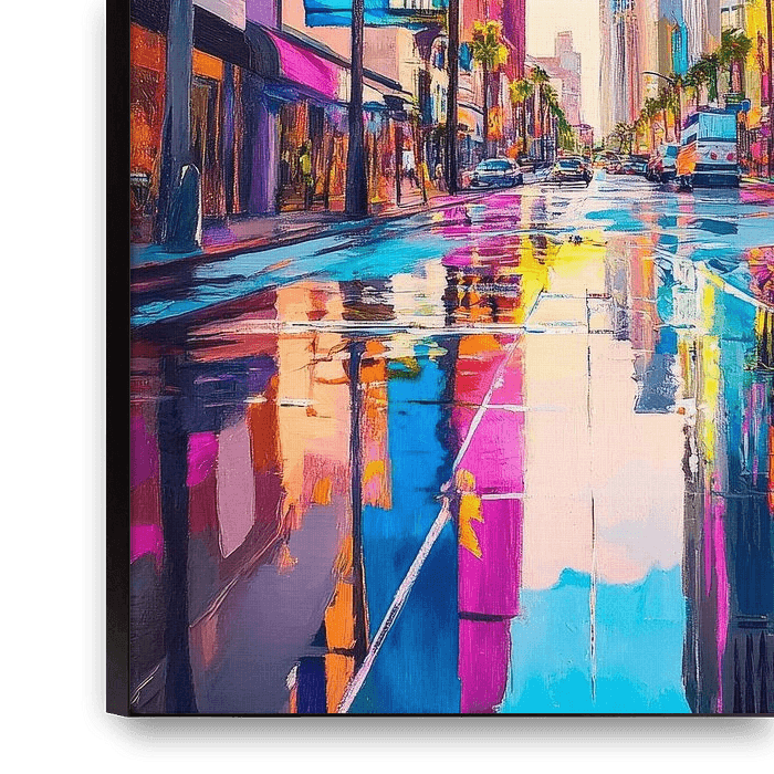 Les couleurs vives et les flaques d'eau réfléchissantes confèrent à ce décor urbain une dynamique excitante. Les hauts bâtiments et les palmiers attirent le regard comme par magie et créent une atmosphère de vie trépidante. Idéal pour le salon, pour apporter une touche d'ambiance urbaine et d'inspiration dans le quotidien.