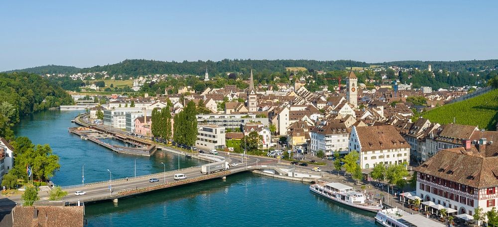 Panorama aérien de la ville de Schaffhouse, à droite la forteresse du Munot