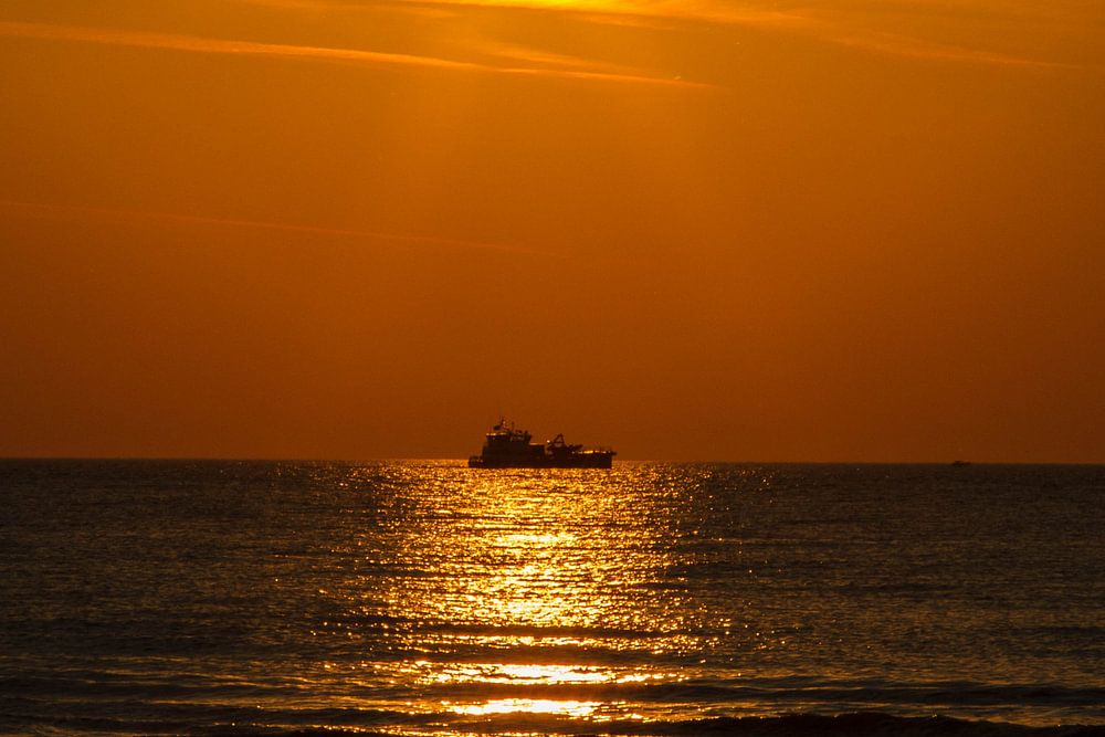 Vissersschip in de glans van de ondergaande zon op Scheveningen strand