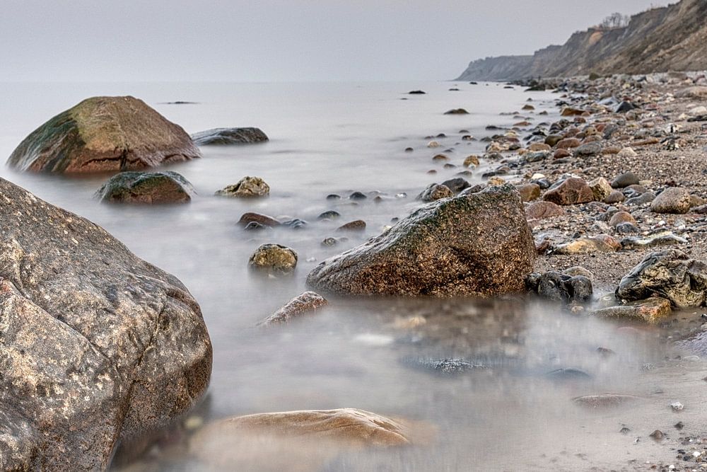 La photographie de paysage "Schwedeneck III" montre la plage déserte de Schwedeneck sur la presqu'île de Dänischer Wohld dans une longue exposition. Au premier plan, des rochers et des galets sont posés sur le rivage. En arrière-plan, la ligne d'horizon conduit le regard au-dessus de la mer Baltique vers la falaise. Prise par un après-midi brumeux au printemps 2025.