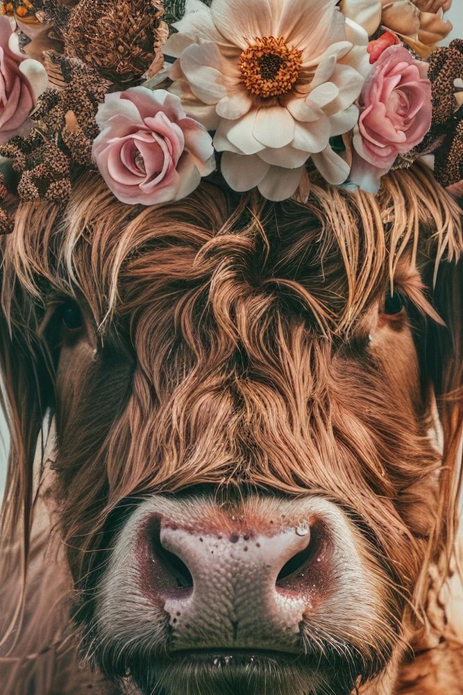 La couronne, composée de fleurs aux couleurs vives et pastel, offre un contraste saisissant avec la fourrure brune et rugueuse de l'animal. Le Highlander regarde le spectateur en face, son regard étant empreint d'un calme serein. La composition de l'image, avec le ciel doux et pastel en arrière-plan, souligne l'atmosphère paisible et presque éthérée. La richesse des détails de la couronne florale, associée à la texture naturelle de la fourrure du Highlander, crée un jeu visuel fascinant entre culture et nature, douceur et force.