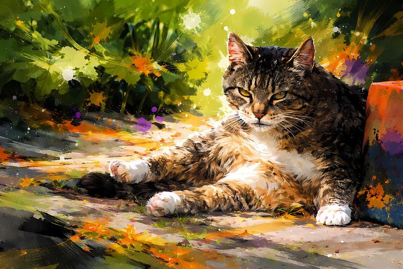 Un chat cypré se prélasse dans un jardin, entouré de touches de couleurs vives. Le pelage du chat contraste avec le fond coloré, créant une scène ludique.