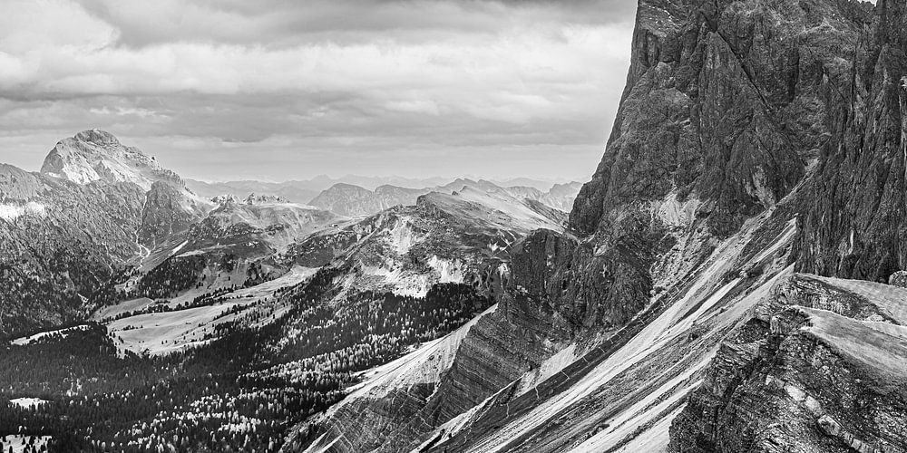 Image panoramique 2:1 du Seceda en noir et blanc.