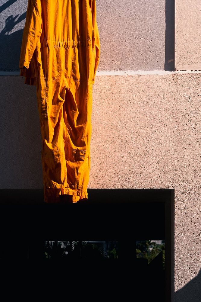 Un ensemble orange vif est suspendu silencieusement dans la lumière chaude du soleil contre un mur rose tendre à Singapour. Le contraste de la couleur et de l'ombre crée une image puissante et minimaliste qui évoque à la fois le calme et la tension. Idéal pour les intérieurs modernes qui aiment la simplicité et le caractère.