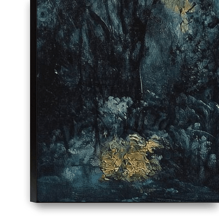 Secret bleu - Cette peinture de paysage montre une mystérieuse forêt bleu foncé éclairée par des accents de lumière dorée, avec un escalier classique en pierre flanqué de statues majestueuses sur des colonnes au centre, évoquant un sens de l'émerveillement et de l'antiquité.