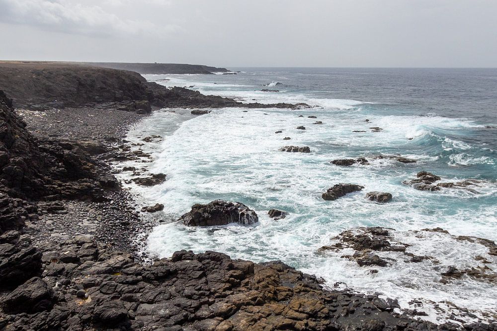 Vue d'une section côtière dans le parc naturel de Jandia (Parque Natural De Jandina) sur l'île canarienne de Fuerteventura, Espagne, avec des graviers, des roches de lave et une mer agitée par les vagues