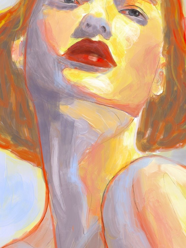 Ce portrait aux tons violacés et bleus fait partie de 3 tableaux du même style. Un gros plan et une femme en robe verte font partie de cette série. Les sujets de mes tableaux ou le style de peinture peuvent être très différents. J'aime le changement et je travaille de l'abstrait au réaliste. Personnes, animaux et natures mortes.