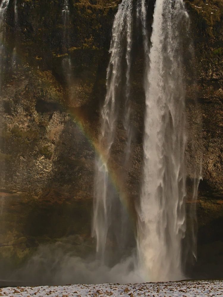 Photo de Seljalandsfoss au soleil du soir en hiver avec arc-en-ciel et prairie enneigée. La chute d'eau Seljalandsfoss est alimentée par le glacier Eyjafjallajökull et constitue l'une des principales attractions du sud de l'Islande. Il est situé directement sur le périphérique. Les chutes d'eau plongent à 66 mètres du bord d'une falaise à cet endroit.
