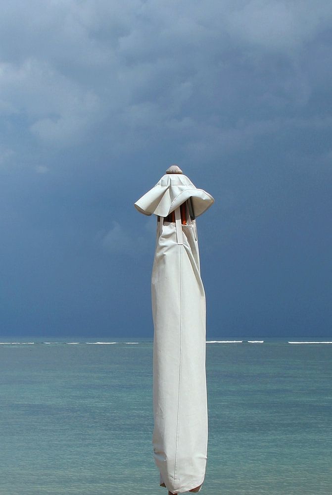Vie à la plage, farniente, détente, sentiment de vacances, vacances à la plage. Bancs de bronzage sur une plage tropicale alors que des orages sombres et des nuages de pluie s'avancent. Le ciel menaçant n'augure rien de bon : averses de pluie, tempêtes et orages. Souvenirs de vacances, Sanur, Bali (Indonésie).