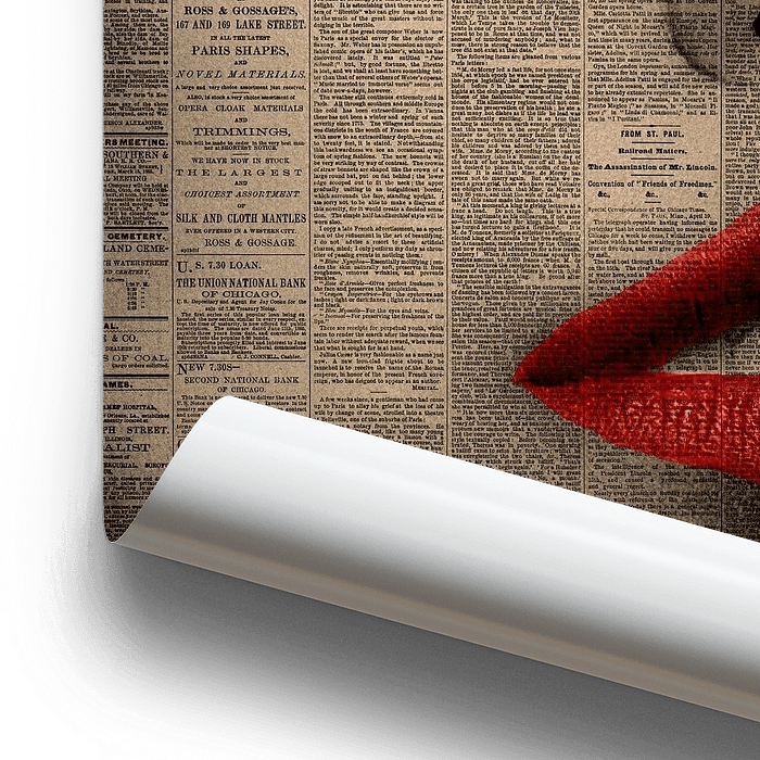 Sensations est une œuvre abstraite mettant en scène le visage d'une femme. Les lèvres rouges ressortent. L'impression abstraite atmosphérique présente la texture d'un journal en arrière-plan. Le visage de la femme est placé au-dessus. Grâce à une technique numérique spéciale, il est possible de fusionner ces deux images.