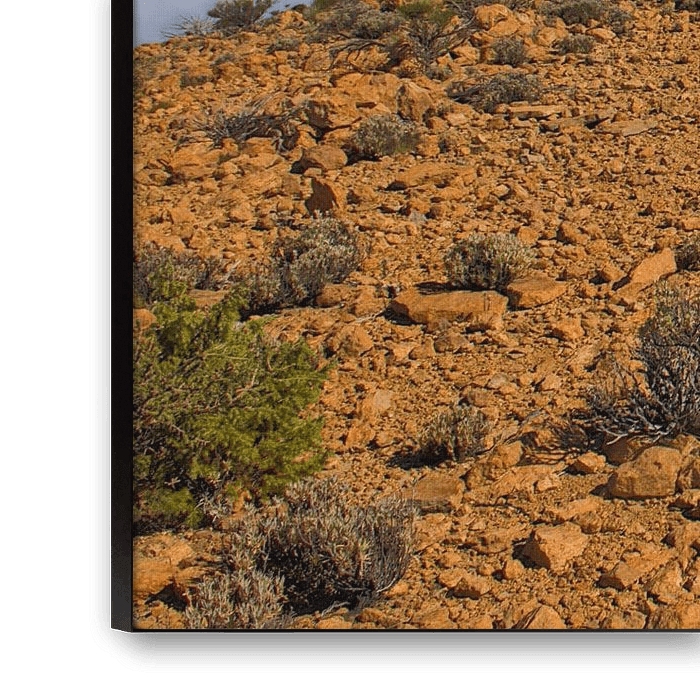 Un sentier de randonnée serpente à travers le paysage volcanique et accidenté du parc national de Teide, à Ténériffe. Entourée de collines rocheuses et de broussailles sèches, sous un ciel bleu brillant, cette scène dégage un sentiment d'aventure et de vaste nature. Idéale pour les amateurs de randonnée, de montagne et de paysages uniques.