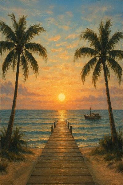 Une peinture à l'huile harmonieuse montre un coucher de soleil tropical avec des palmiers, un ponton en bois et des couleurs douces dans les tons orange, rose et bleu. Il évoque le calme, la chaleur et la nostalgie - un endroit pour rêver et se déconnecter. Idéal pour tous ceux qui aiment la mer, les voyages et la beauté naturelle ou…