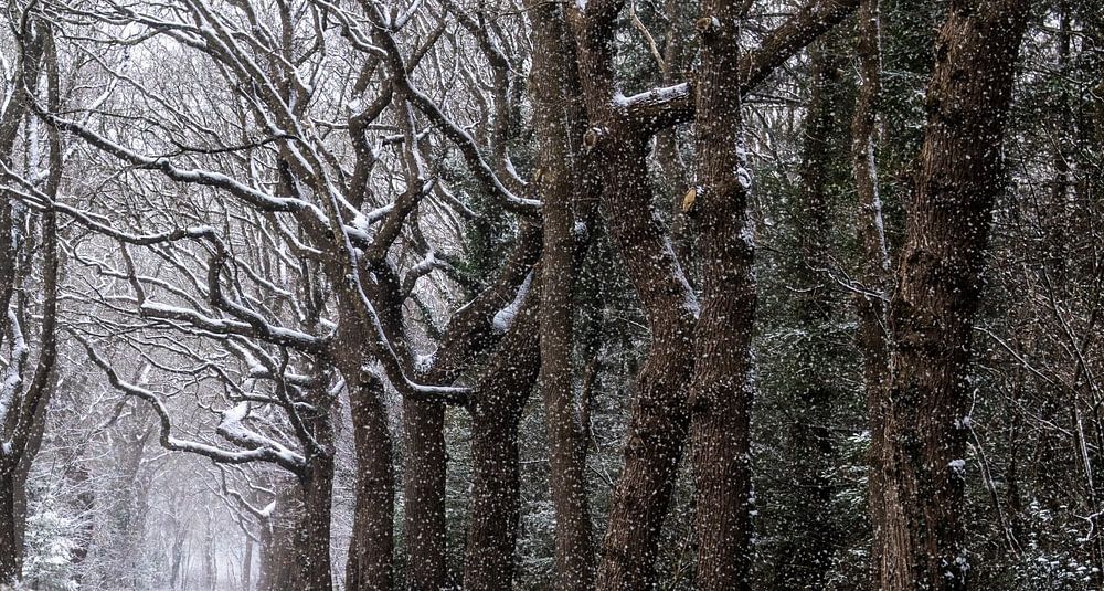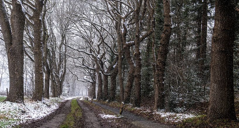 De beaux arbres enneigés et une vieille route non goudronnée à Havelte confèrent à cette image hivernale une atmosphère paisible.
