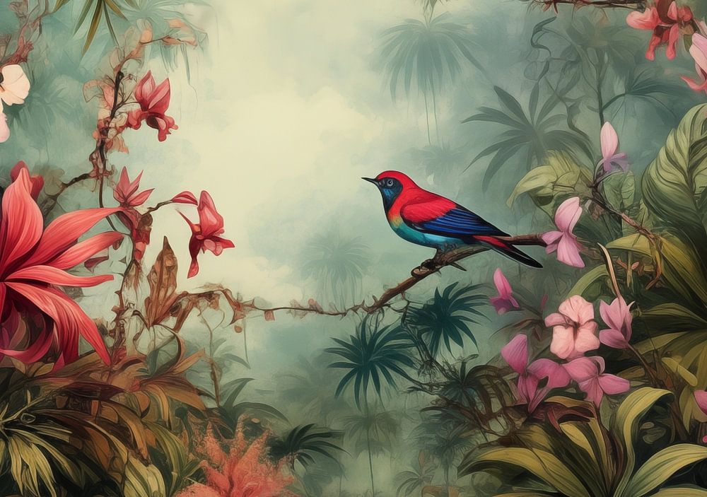 Une célébration de la diversité naturelle et de la couleur, une symphonie silencieuse dans laquelle la flore et la faune se rencontrent dans une composition harmonieuse. De belles couleurs saturées qui conduisent le regard vers le point central de la toile : un oiseau au plumage tel un joyau vivant. Entouré d'une verdure luxuriante et de fleurs, l'oiseau souligne la vitalité de la vie dans la jungle.