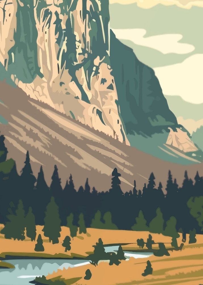 Découvrez la tranquillité du parc national de Yellowstone avec ce poster à couper le souffle. La rivière calme serpente dans une vallée luxuriante, avec des montagnes imposantes en arrière-plan. Un élan majestueux se tient paisiblement au bord de l'eau, ajoutant une touche de vie sauvage à cette scène sereine.
