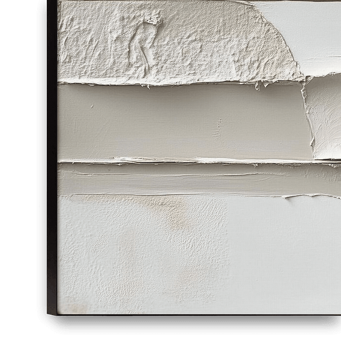 Un design minimaliste et tactile qui met l'accent sur les textures superposées et les couleurs douces et neutres. La composition se compose de plans horizontaux et de textures allant du lisse au rugueux, ajoutant une profondeur et un mouvement subtils. Les couleurs - une palette harmonieuse de tons blancs, beiges et sable - renforcent…