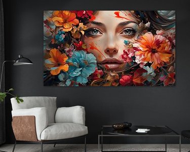 Cette création vibrante capture l'essence pure des fleurs épanouies, encadrées par le regard rêveur d'une femme.