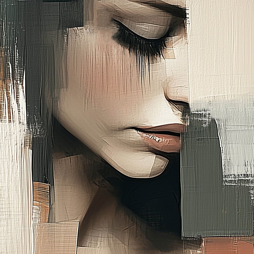 Portrait de femme dans lequel les traits doux et expressifs du visage sont entrelacés avec un arrière-plan abstrait de coups de pinceau. Les yeux de la femme sont fermés, ce qui évoque un sentiment d'introspection et de vulnérabilité. Son visage semble presque se dissoudre dans les couleurs environnantes, qui se composent de tons chauds et froids tels que le beige, le brun et les nuances de gris. Les coups de pinceau varient en épaisseur et en direction, créant un jeu dynamique de texture et de superposition.