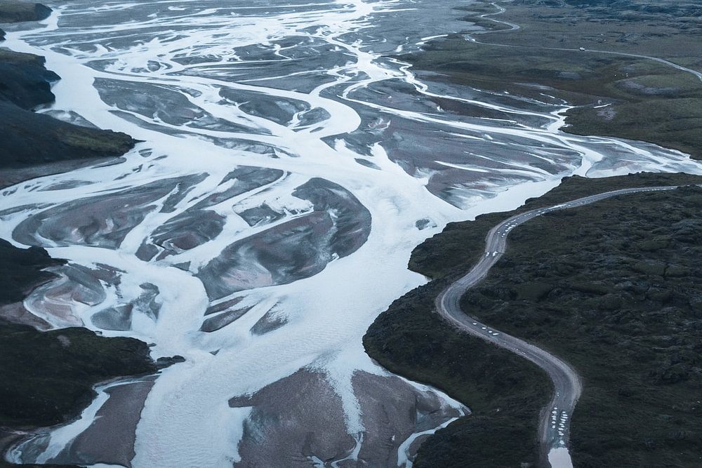 Depuis les airs, le paysage accidenté et impressionnant des hauts plateaux islandais se dévoile. Cette photo prise par un drone montre une vaste zone, où d'étroites rivières glaciaires se frayent un chemin à travers la roche volcanique sombre. Une route solitaire serpente le long de l'eau, avec une petite voiture au loin, à peine visible mais juste assez pour faire ressentir l'échelle écrasante du paysage.