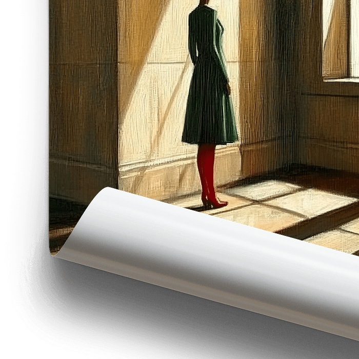 Portrait stylisé d'une femme seule se tenant dans la lumière des grandes fenêtres d'un bâtiment imposant dans une métropole. Le réalisme magique crée une image chargée. En raison de la perspective et de l'espace vide autour de la femme, l'œuvre respire la solitude. Le monde extérieur semble lui échapper.