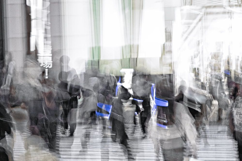 Une scène urbaine animée capturée avec un flou de mouvement, créant une sensation dynamique et chaotique alors que les gens se déplacent dans une rue de la ville. Les enseignes lumineuses et les différentes nuances de lumière ajoutent à l'atmosphère vibrante de ce décor métropolitain.
