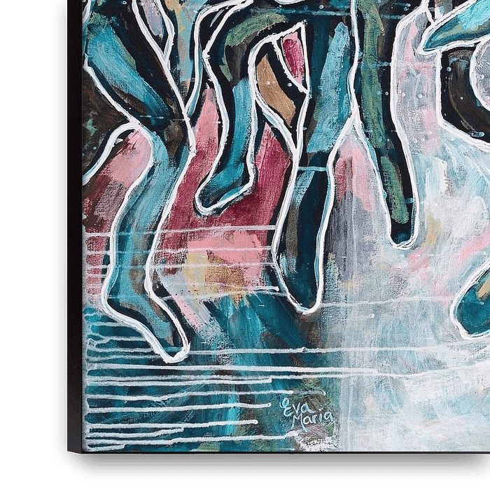 Le tableau parle de changement, d'un passage à une nouvelle phase de la vie. C'est un grand tableau de "personnes en abstraction" ou j'aime aussi les décrire comme "une suggestion de personnes". J'aime peindre des formes humaines et combiner différentes poses. Inspirée par les danseurs, j'ai créé ce…