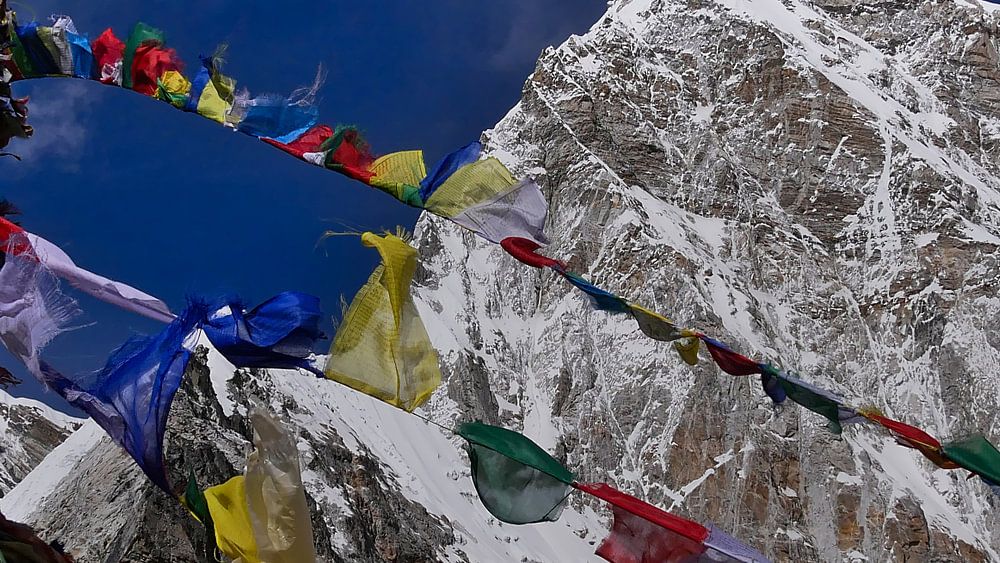 Drapeaux de prière bouddhistes colorés flottant au vent au sommet du Kala Patthar au Népal, dans l'Himalaya, au pied du puissant mont Pumori (7 161 m).
