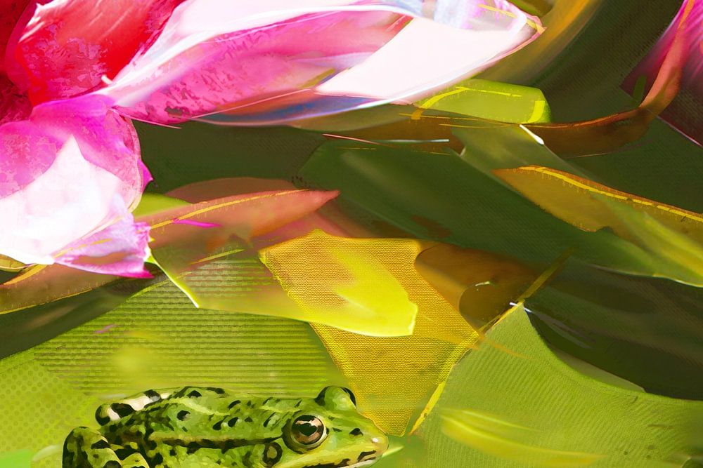 Une grenouille verte se repose tranquillement sur un nénuphar, entourée de nénuphars roses et rouges exubérants. Cette œuvre a été créée à partir d'une photographie que j'ai prise au bord de mon propre étang, puis éditée dans Photoshop en une composition colorée, presque onirique. Les couleurs éclaboussent la toile : des pétales d'un rose tendre aux feuilles d'un vert profond, en passant par une surface d'eau chatoyante et pleine de texture. La grenouille est assise calmement, témoin silencieux d'une journée d'été dans la nature.