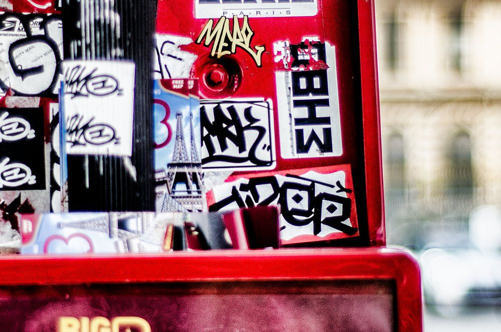 Autocollants collés à l'arrière d'un arrêt de bus à Paris