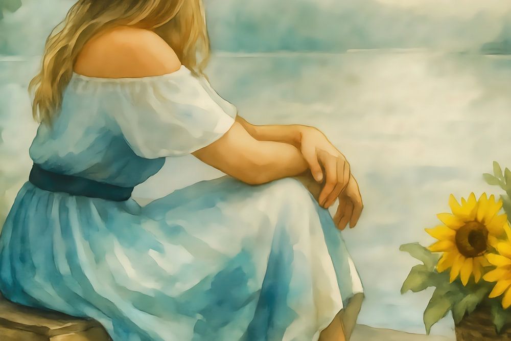 Le tableau représente une scène paisible dans un style aquarelle. Une femme aux cheveux blonds, coiffée d'un grand chapeau de soleil blanc et vêtue d'une robe bleu pâle, est assise pieds nus sur une caisse en bois posée sur une jetée. À côté d'elle, un panier rempli de tournesols rayonnants offre un contraste chaleureux avec les tons…