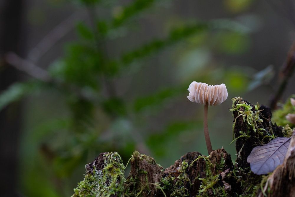Cette photographie capture un moment de beauté feutrée au cœur de la forêt. Un champignon fragile se dresse fièrement sur une vieille souche d'arbre recouverte de mousse, entouré de feuilles mortes et de signes d'éphémère. La lumière douce et naturelle accentue les détails du champignon et de la mousse, tandis que l'arrière-plan s'estompe dans une brume douce et rêveuse. Il en résulte une image intime qui respire la tranquillité et le mysticisme.