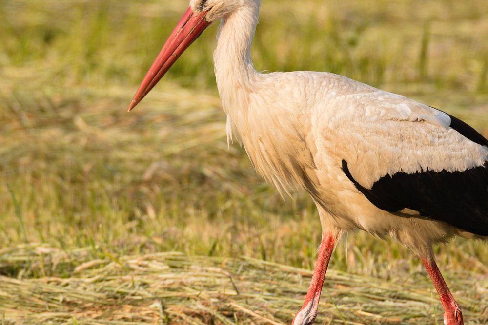 Dans la douce lumière du soir, une cigogne se promène dans le champ fraîchement fauché à la recherche de nourriture. La lueur chaude et les couleurs naturelles apportent calme et sérénité, un instantané du paysage néerlandais dans toute sa pureté.